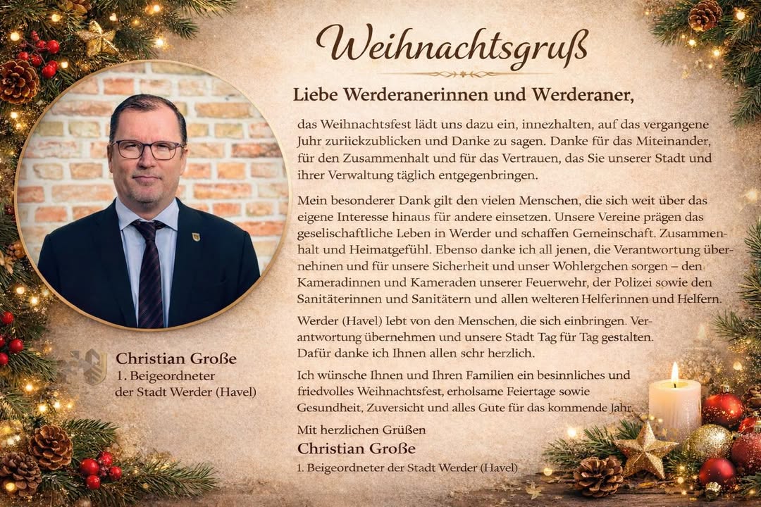 mehrLiebe Werderanerinnen und Werderaner,das Weihnachtsfest lädt uns dazu ein, innezuhalten, auf das vergangene Jahr zurückzublicken und Danke zu sagen. Danke für das Miteinander, für den Zusammenhalt und für das Vertrauen, das Sie unserer Stadt und ihrer Verwaltung täglich entgegenbringen.Mein besonderer Dank gilt den vielen Menschen, die sich weit über das eigene Interesse hinaus für andere einsetzen. Unsere Vereine prägen das gesellschaftliche Leben in Werder und schaffen Gemeinschaft, Zusammenhalt und Heimatgefühl. Ebenso danke ich all jenen, die Verantwortung übernehmen und für unsere Sicherheit und unser Wohlergehen sorgen ? den Kameradinnen und Kameraden unserer Feuerwehr, der Polizei sowie den Sanitäterinnen und Sanitätern und allen weiteren Helferinnen und Helfern. Ihr Engagement verdient höchste Anerkennung und großen Respekt.Werder (Havel) lebt von den Menschen, die sich einbringen, Verantwortung übernehmen und unsere Stadt Tag für Tag gestalten. Dafür danke ich Ihnen allen sehr herzlich.Ich wünsche Ihnen und Ihren Familien ein besinnliches und friedvolles Weihnachtsfest, erholsame Feiertage sowie Gesundheit, Zuversicht und alles Gute für das kommende Jahr.Mit herzlichen GrüßenChristian Grosse #Weihnachten #dankbar #familie #werder #heimat #freude #ruhe #entspannung